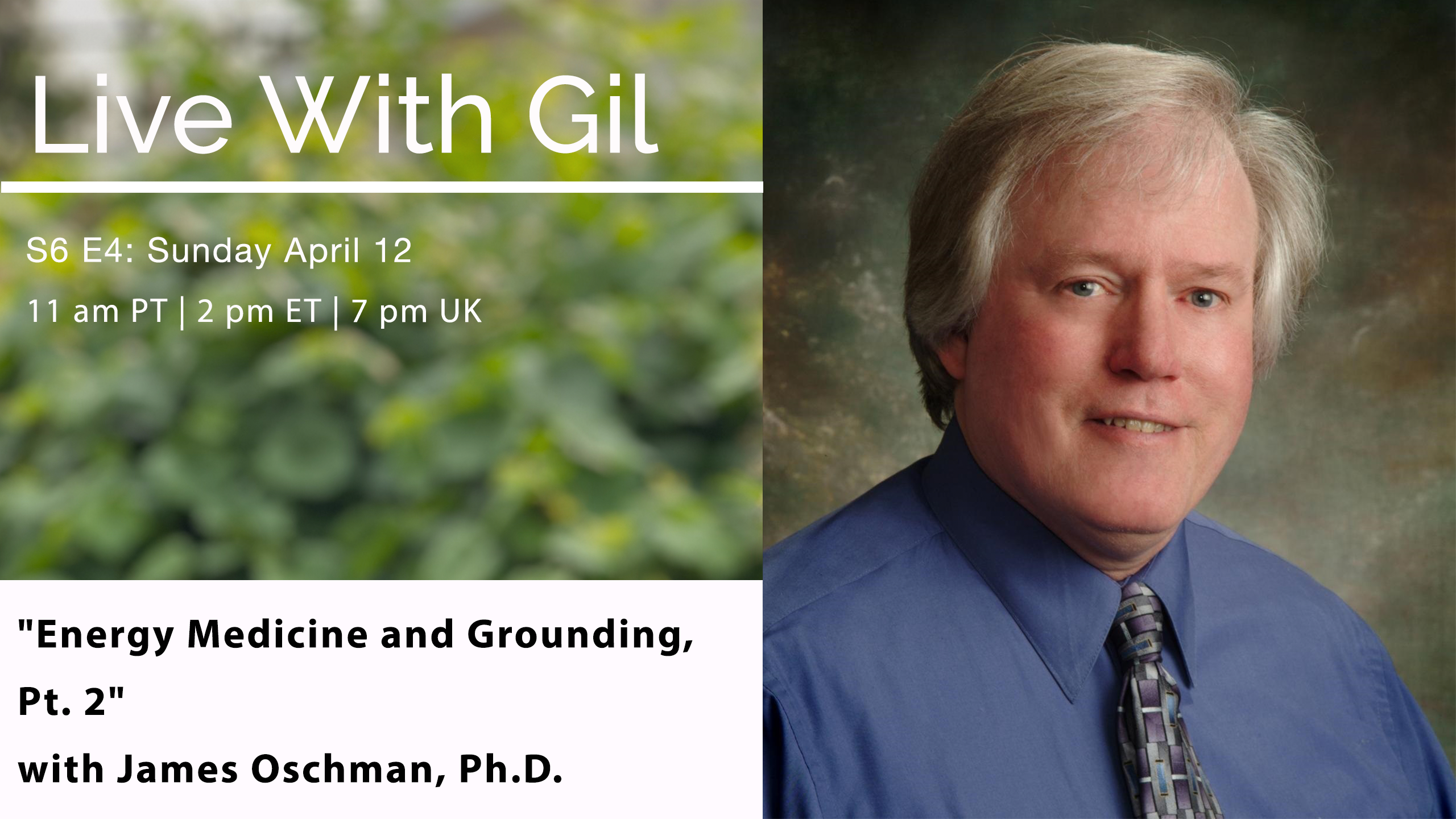 "Energy Medicine and Grounding, Pt. 2" with James Oschman, Ph.D. This coming Sunday, April 12th (11am Pacific, 2pm Eastern, 7pm UK time) on "Live with Gil." Please join me and my friend and colleague, energy medicine pioneer, author and researcher, the legendary James Oschman, Ph.D., as we have a fun and thought provoking real-time conversation about his career investigating the wild world of energy phenomena and the therapeutic implications for us all. Jim has been an inspiration to me for decades and his mind blowing work will fill you with wonder, spark your curiosity and fill you with excitement!